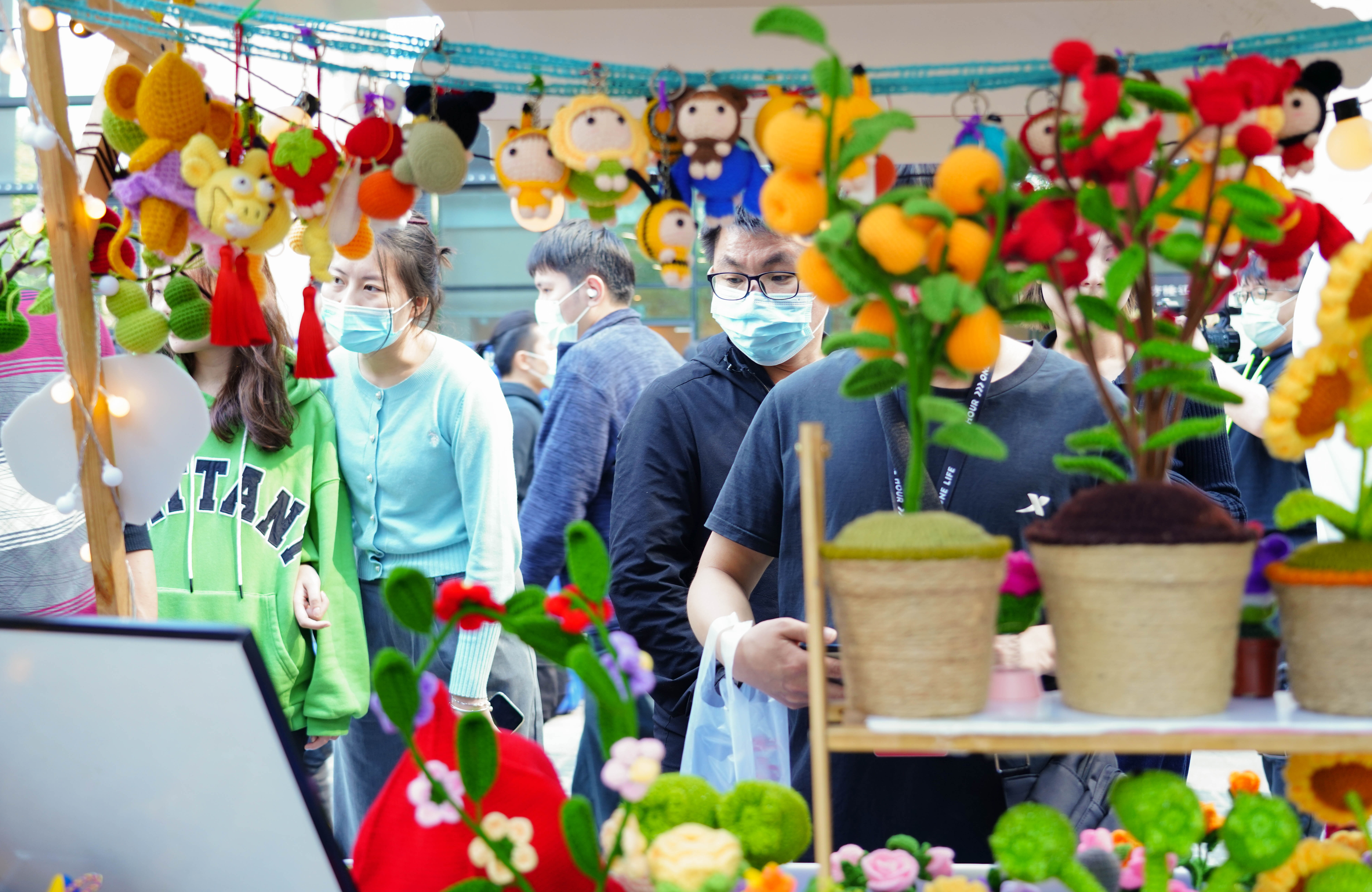 记者在现场看到,15个摊位中不仅有非遗工艺、手工饰品等传统的集市元素,还有潮玩手办、DIY等潮流业态,不少上班族逛下来一圈之后都能有收获。值得一提的是,这15个摊位中还调动了来自园区企业的产品。深圳知知品牌孵化有限公司于去年年初入驻,本次集市他们也推出了一批应季产品,LED美妆灯、手拿包等物件都吸引了不少上班族的光顾。该企业有赞微商城负责人Vicky表示,为了吸引客流,他们还推出了特价产品及内购福利价,让更多消费者能够买到心头好。“他们感兴趣的主要是一些比较新奇的产品,比如迷你类的包包款就比较受女生欢迎。我们拿出的产品不仅有颜值,还给出了清仓的价格,性价比还是比较高的。”