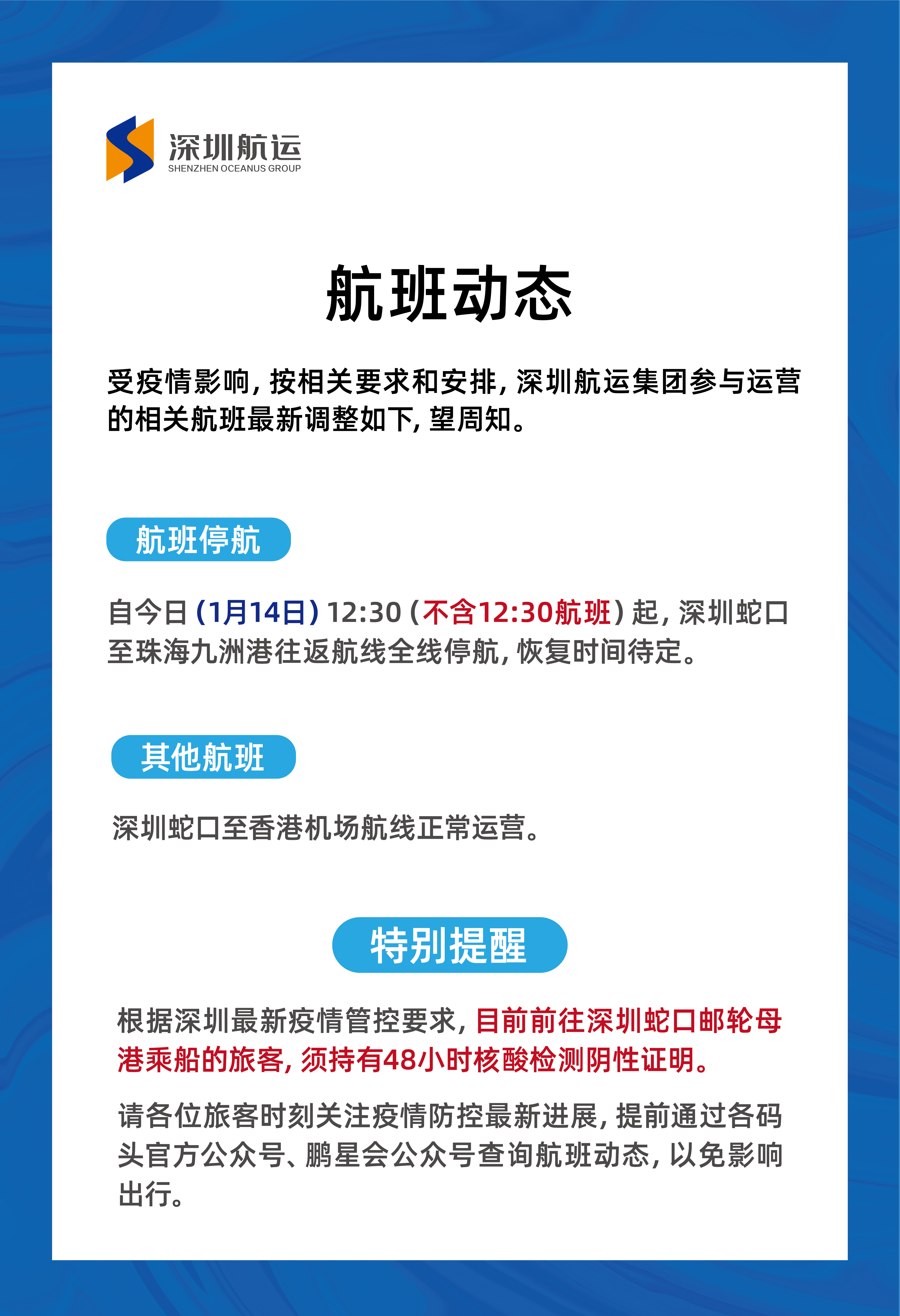 深圳航运集团特别提醒,根据深圳疫情防控最新要求,前往码头乘船旅客须持48小时核酸阴性证明。请出行前通过各码头公众号、鹏星会公众号等及时查询航班动态,以免影响出行。