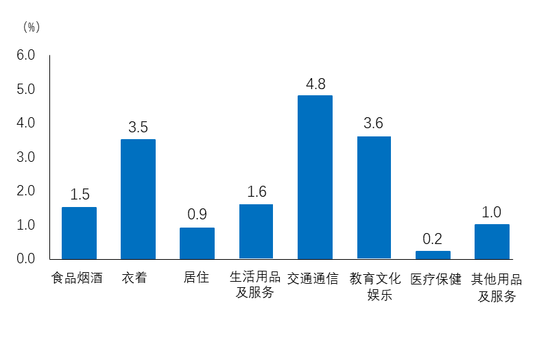 其他七大类价格同比均上涨。其中,交通通信价格上涨4.8%,教育文化娱乐价格上涨3.6%,衣着价格上涨3.5%,生活用品及服务价格上涨1.6%,其他用品及服务价格上涨1.0%,居住价格上涨0.9%,医疗保健价格上涨0.2%。