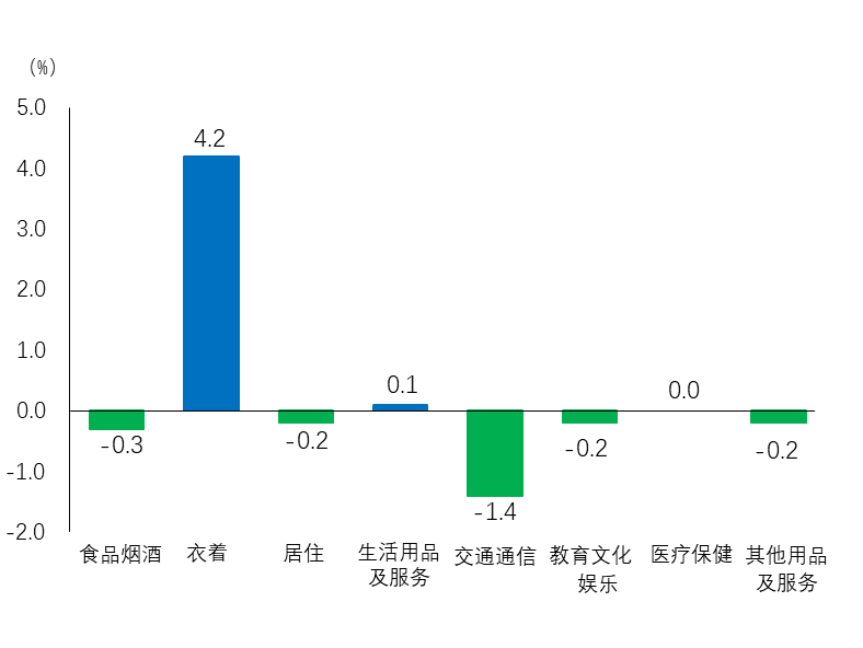 其他七大类价格环比二涨四降一平。其中,衣着价格上涨4.2%,生活用品及服务价格上涨0.1%;交通通信价格下降1.4%,教育文化娱乐价格下降0.2%,其他用品及服务价格下降0.2%,居住价格下降0.2%;医疗保健价格与上月持平。