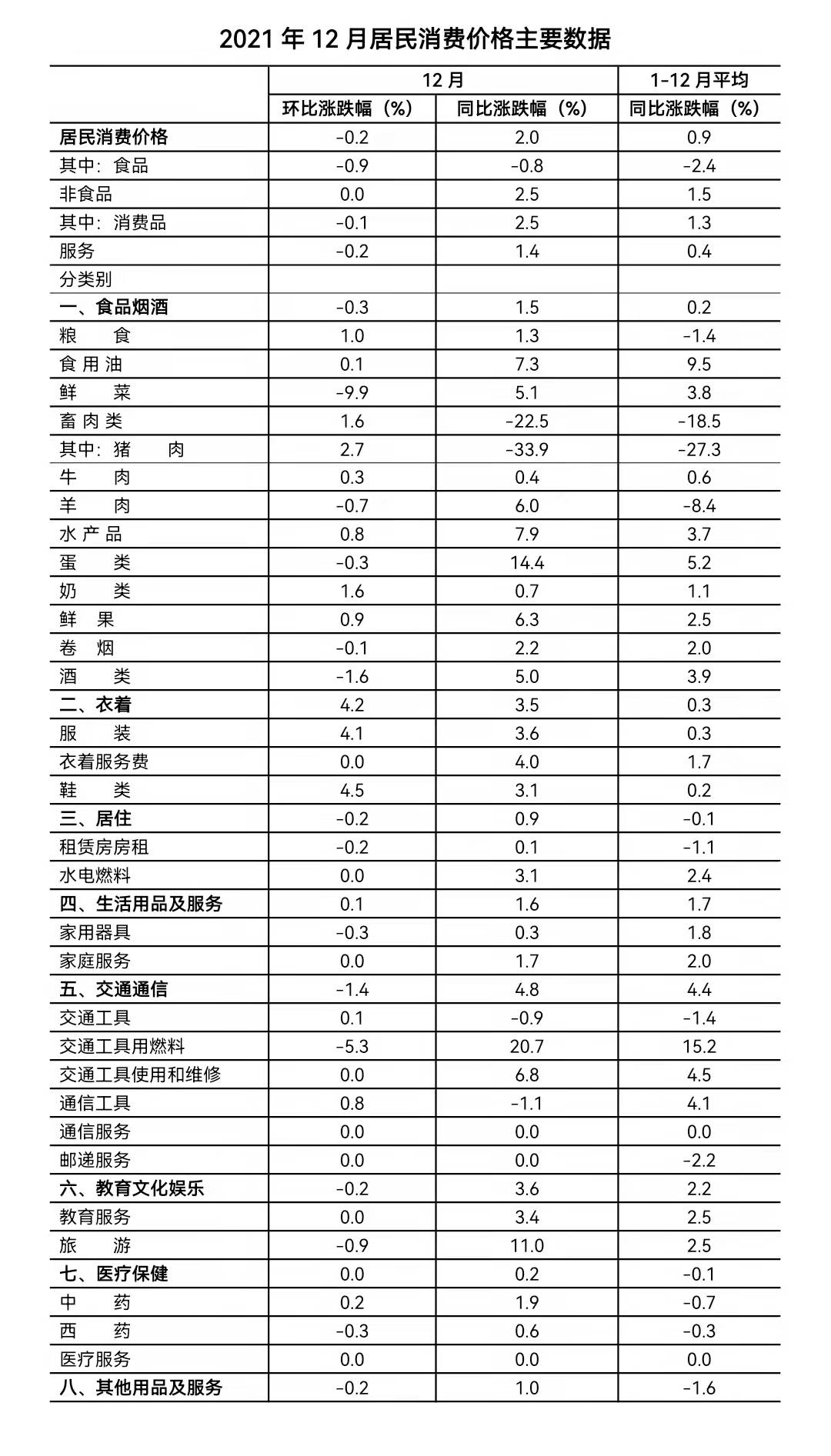 12月份,食品烟酒价格同比上涨1.5%,影响CPI上涨约0.43个百分点。其中,蛋类价格上涨14.4%,食用油价格上涨7.3%,鲜果价格上涨6.3%,鲜菜价格上涨5.1%;畜肉类价格下降22.5%(其中,猪肉价格下降33.9%)。