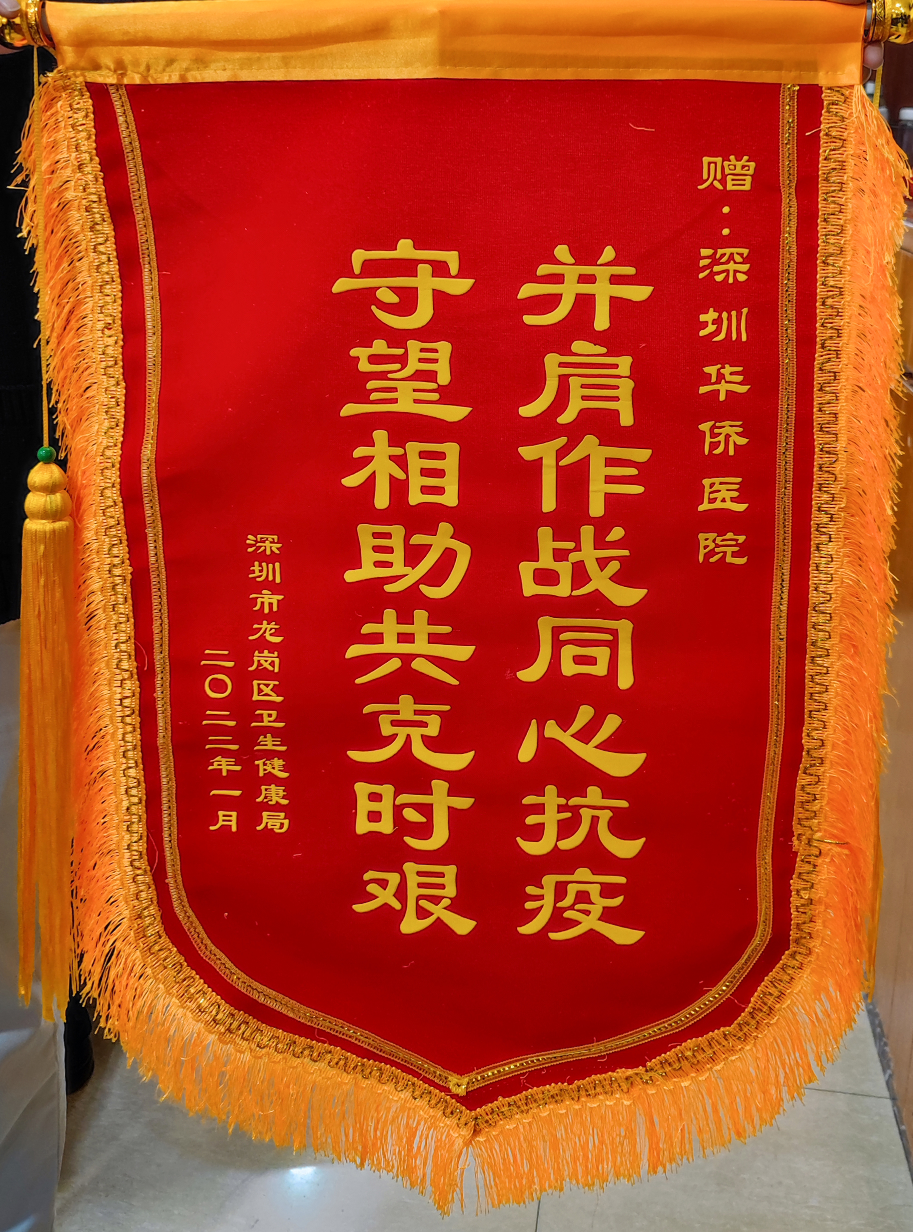 10日傍晚,龙岗区卫健局向深圳华侨医院奋战在一线的医护人员送来一面锦旗,感谢医护人员的辛勤付出,锦旗上“并肩作战同心抗疫,守望相助共克时艰”的大字分外耀眼。