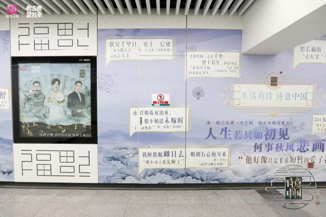 新一季节目打造的场景化营销也可圈可点,节目开播前,深圳卫视在深圳的一个地铁通道里搭建了一个诗意长廊,里面均是用网感语言对古诗词的现代解读,如“城门失火,殃及池鱼”之于“躺着也中枪”,“反是不思,亦已焉哉”之于“友尽”等等。